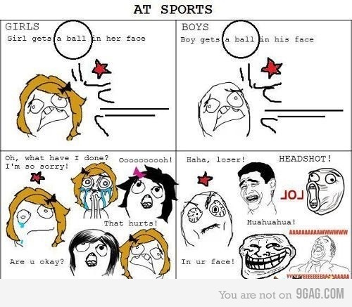 Was hieran eine sexistische Kackscheiße ist, erschließt sich mir nicht. Es sei denn vielleicht man sieht es als einen essentialistischen Vorschlag an, nachdem jeder Mann und jede Frau so handeln würden. . Mir scheint es aber eine durchaus präzise, wenn auch überspitzte Darstellung der Realtität im Schnitt zu sein. Frauen reagieren eben eher als Männer mit emotionaler Unterstützung (Tend and Befriend) und können es sich eher leisten, Gefühle zu zeigen, während Jungs im Rahmen des „Rough and Tummble„-Play das ganze in einen Wettbewerb einordnen und sich daher eher ein paar Sprüche drücken.