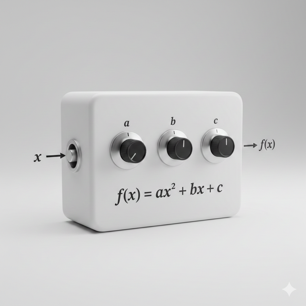 Als Beispiel nehme ich die Polynomfunktionen zweiten Grades, also die bekannten quadratischen Funktionen, die jeder aus der Schule kennt. Diese Funktionen haben die Form f(x)=ax2+bx+c wobei a,b,c die Parameter der Funktion sind. Man kann sich das ganze als Box vorstellen, mit Einstellknöpfen für die Parameter.